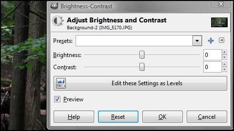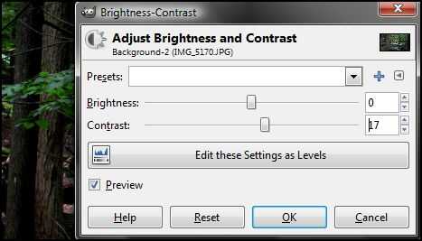 El primer paso en la edición es que capas de la caja de herramientas y haga clic en duplicar (Foto 2) y luego seleccione la nueva capa (copia de fondo) y haga clic en: colores > brillo contraste y deslice la barra de contraste hasta un punto donde las partes de la imagen que eran negro o más oscuro en la vida real son los mismos en la imagen. A continuación mi antes y después de fotos y usted puede ver opté por un ajuste de + 17 y usar los árboles como mi guía. Puede que deba jugar con esto un rato.