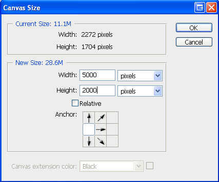 Puede guestimate el tamaño de su panorama final. No importa si sale mal, como si te quedas sin lona que siempre puede aumentar más adelante. Asegúrese de ajustar el anclaje adecuado dependiendo de la posición de la foto partida en el panorama. No te olvides de aumentar el tamaño vertical un poco demasiado como el horizonte no puede ser exactamente el mismo nivel para cada foto.