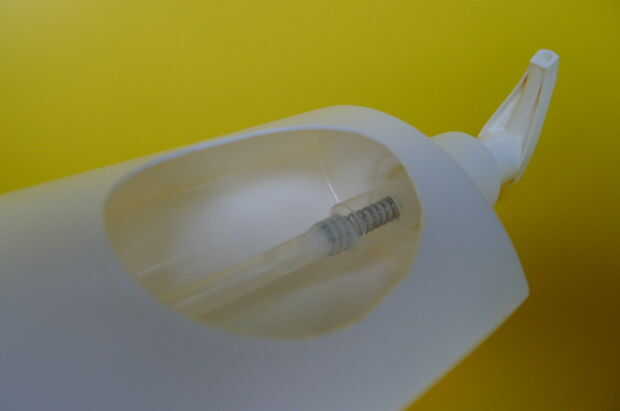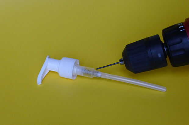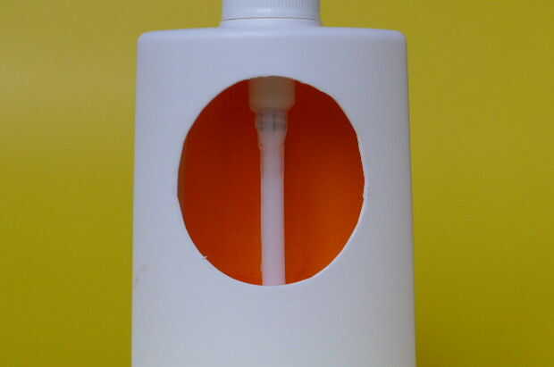 Como se explicó en el paso anterior, se hizo un puente en el propósito para reducir la salida de jabón del dispensador. El agujero redondo en el contenedor es solo para ver lo que está sucediendo. El cuadro en la introducción (primer cuadro) muestra lo que sucede cuando se activa la palanca del dispensador: parte del jabón líquido brota dentro del recipiente.