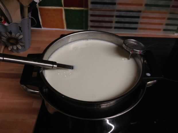 Coloque el pote más pequeño dentro del más grande, llenando el espacio entre los dos con agua. Coloque en la estufa y agregar la leche y el motor de arranque. Si utiliza de arranque casa suero de mantequilla cultivado de los cubos congelados, vierta la leche en una taza esterilizada y añada los cubos de la cultura a la taza. Permita aproximadamente 10 minutos descongelar antes de inocular el lote.