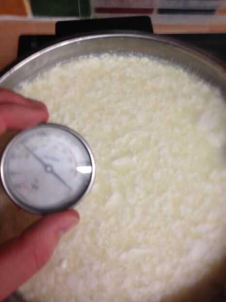 Después de comprobar para romper, cortar la cuajada en cubos de 1/2 pulgada y poco a poco el calor, 2° F cada 5 minutos o 1° C cada 5 minutos aproximadamente. Esto debe tomar 45 minutos y finalizar con una temperatura de 40° C (104° F)