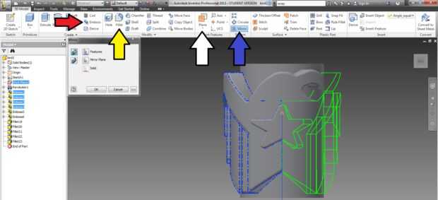3. ahora que tiene la mitad del anillo de la manera que desee, haga clic en la pestaña de "Espejo", como se indica por la flecha azul y reflejan todas las características, desea, a través del borde plano del su anillo como se ve en la imagen. Si usted quiere algunas de las características del "espejo" pero no tiene un borde plano, puede crear un plano para reflejar a través. (La pestaña de "Plano" es indicada por la flecha blanca).