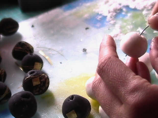 Ahora pincha un agujero en el talón con un alambre fino o el extremo plano de un palo de bambú enharinada.