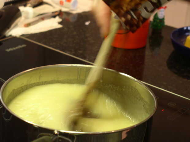 Las cosas se mueven muy rápido desde este punto hacia adelante. Tener tus chips de chocolate listos para servir, el abierto de crema de marshmallow y la vainilla y teaspooner listo.