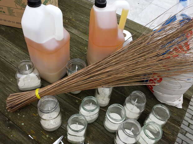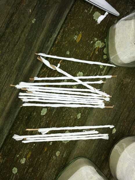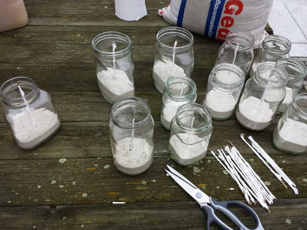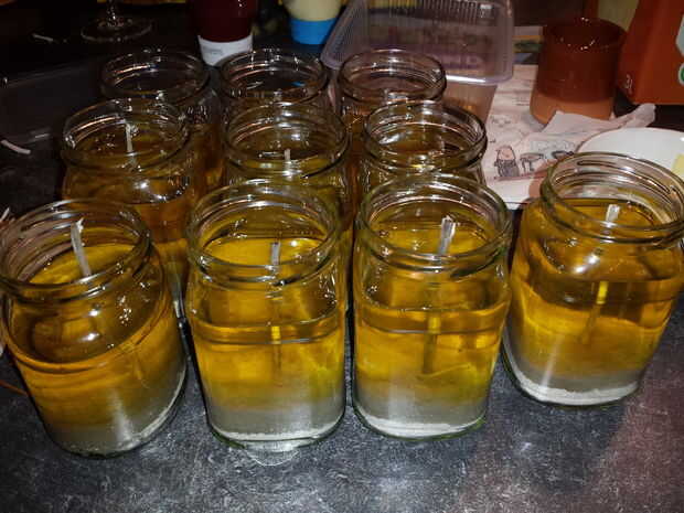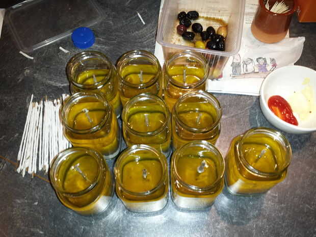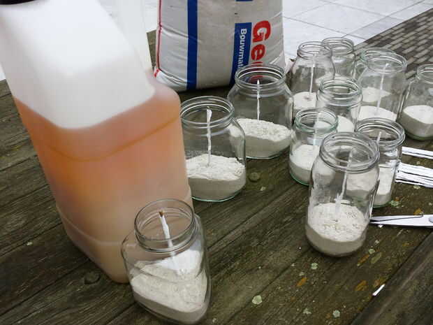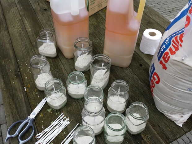 hacer desde el vano de una hoja de plátano, un fusible. envuélvalo en 1 capa de papel higiénico (cortarlo por la mitad). Llene un recipiente de vidrio con arena, poner el fusible en él y rellenar con aceite usado (no importa qué). Ahora tienes una vela exterior que dura horas ;-)