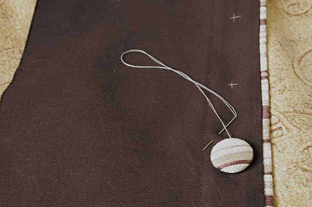 Marque el lugar de los botones en el lado derecho de la tela marrón. En primer lugar uno está en el centro, adicional que dos son 3" pulgadas, ambas direcciones. Coserlas.