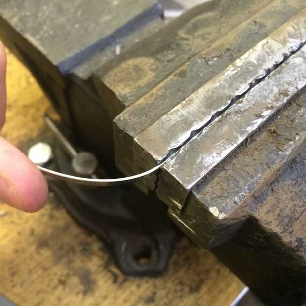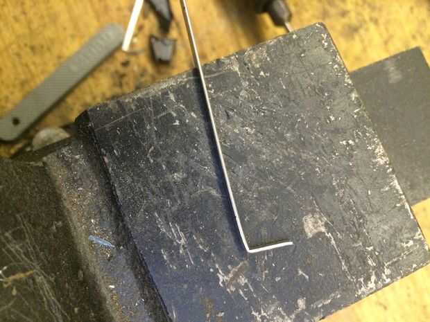 Use un tornillo de banco o pinzas a presión apagado un trozo pequeño de acero del resorte de la varilla. Debe ser alrededor de 10cm de largo pero hará cualquier tamaño por encima de 8cm. Utilice su vice para poner una 1-2cm de la curva a 90°.