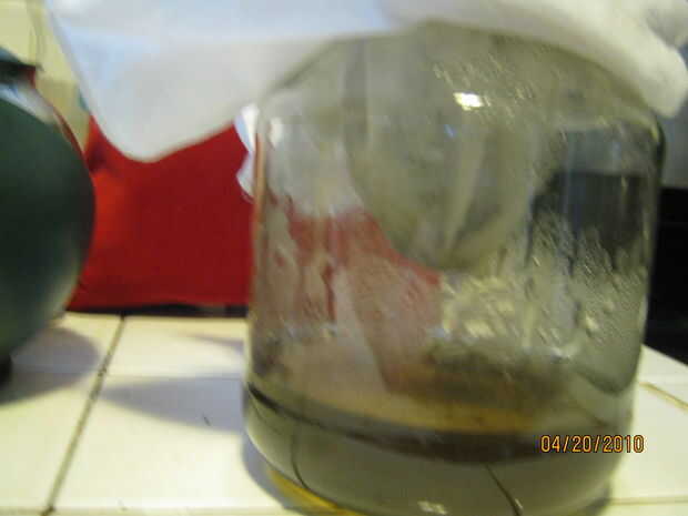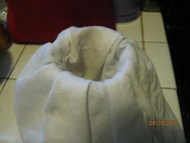 Verter el contenido de la cacerola con el pañuelo en la jarra. Recoger las esquinas del pañuelo y levante apagado/fuera de la jarra. Apriete para capturar cualquier líquido restante, luego deseche hierbas y pañuelo de enjuague.