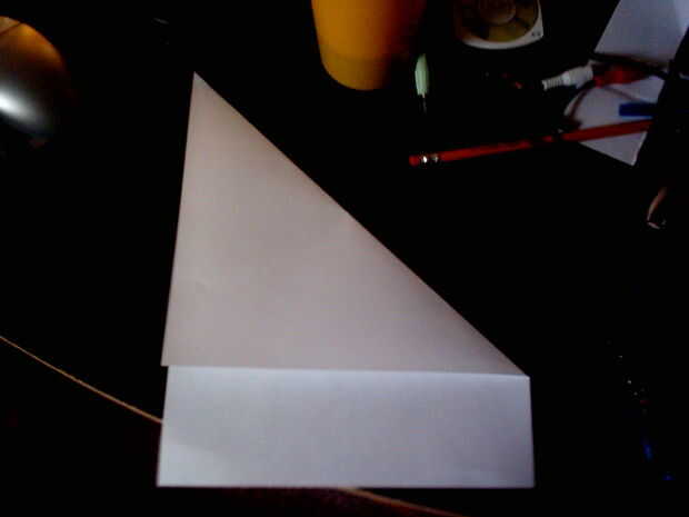 Este pliegue es muy fácil. Todo lo que tienes que hacer es tomar la parte superior izquierda o superior derecha y arrastrar diagolaly al otro lado hacer un triangulo con un rectángulo en la parte inferior