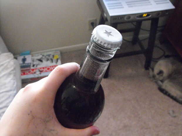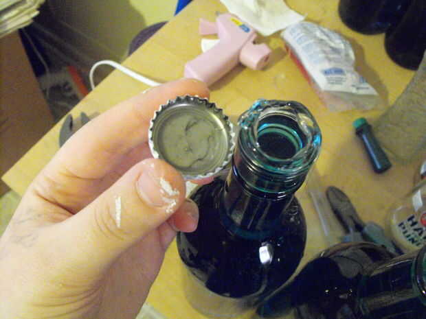 Después de hecho esto, estarás listo para pegar las tapas en. La mejor manera que encontré hacer esto era (después de asegurar la boca de la botella estaba seco) trazar un círculo de pegamento caliente en la parte superior de la botella y luego una buena cantidad en el interior de la tapa, sobre todo alrededor de los bordes. Coloque la tapa en su lugar y golpee hacia abajo en la botella con un martillo o un zapato o algo. Si cola rezuma hacia fuera, limpie, teniendo cuidado de no quemarse. También, si eres particular acerca del patrón en la tapa de la botella, entonces puede que desee intentar pegamento de goma antes de pegamento caliente; el calor del pegamento debilitará la pintura, lo que es frotis muy fácilmente.