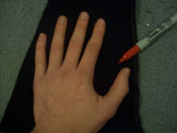 Ponen en primer lugar, a dos capas de la tela que vas a usar, he usado la manga de un viejo bajo la camisa de la armadura. Luego, trazar su mano con un marcador sobre la tela (si su tela es de color negra a continuación, puede utilizar un marcador rojo o plata para que se vean).
