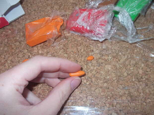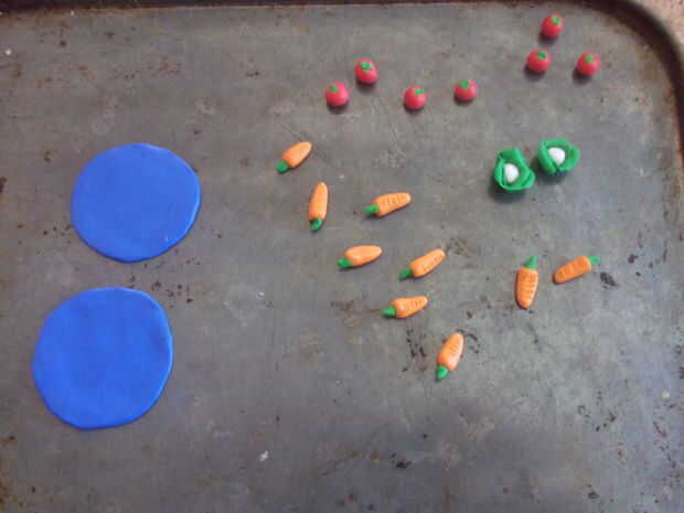 Añadir algún interés extra hace algunas verduras pequeñas de fimo arcilla y al horno durante 20 minutos a 160 grados (horno) y esto había unido a la placa con un celofán transparente.