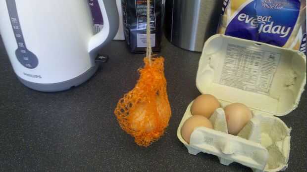 Cuando se hace debe poder sostener el huevo en la red utilizando los extremos de los cordones. Asegúrese de que usted no corte la cadena muy corta que se utilizará para colgar los huevos en la olla.