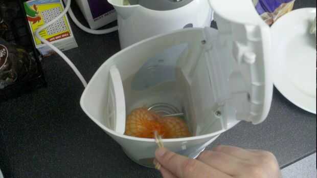 Una vez que haya hervido el agua baje los huevos en su red en el hervidor de agua y atrapar el lazo en la tapa de la caldera.