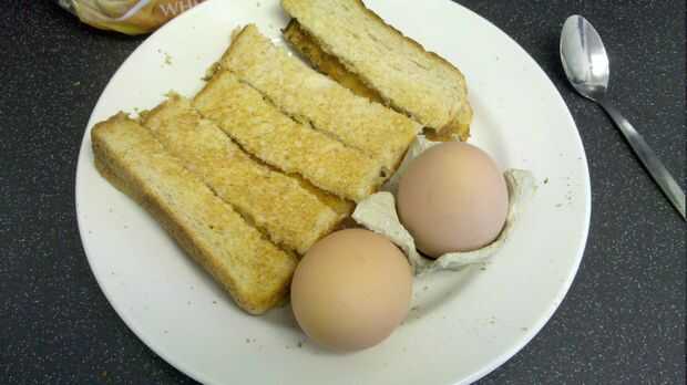 Cortar la parte superior del huevo apagado así que hay un agujero lo suficientemente grande como para sumergir su tostada y usted está listo para comer.