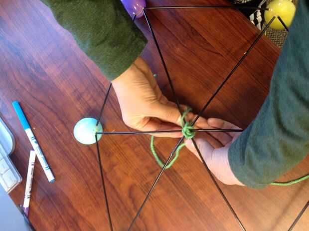 a continuación, conecte toda la paja con un hilo y la aguja y atarla con un bostezo varias veces que harán de una forma de hexágono. Prefiero esta forma porque no es no muy pocos o demasiados. Elegí hilo & aguja porque se pueden conectar a todos y un peso menor que otros materiales.