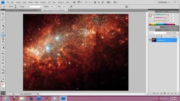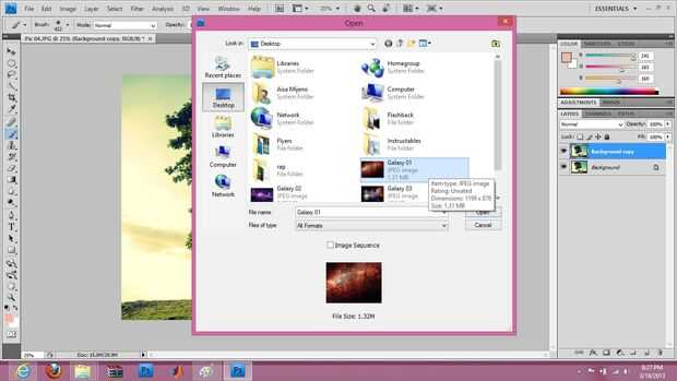 Abre tu imagen de galaxia solicitadas. Por favor recuerde que la imagen de la galaxia que eliges será responsable por el patrón de la superposición. Si es demasiado brillante, o el color no es compatible con tu imagen, no importa el color de la galaxia. Siempre podemos cambiar la tonalidad y ligereza de la imagen de la galaxia.