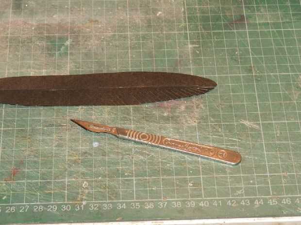 Ahora sus afiladas tijeras o bisturí / cuchillo del arte y una serie de cortes desde el borde de la pluma hacia la vaina en espacios regulares 1/8 o 3mm aparte. Recuerde solo corte lo suficientemente profundo para dejar un espacio de 1/8 o 3mm entre el corte y el doblez de la columna vertebral. Quiere acabar con aproximadamente 1/4" o 6mm de la columna / vaina sin cortar como esta forma la fuerza de la pluma.