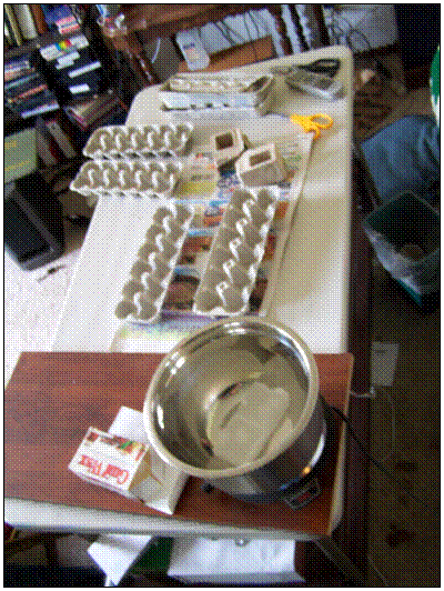 Nota: Algunas personas llenan las copas sólo cera, pero la cera es flamable como keroseno, necesita una mecha orgánica para quemar. No te preocupes, habrá un montón de cera sobrante para cubrir su madera (yesca y leña). Remover la cera de fusión con un pincho de bambú o palillo paletas madera.