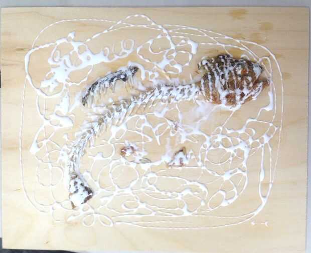 Encontrar un tablero de madera de tamaño perfecto y añadir los huesos de pescado en él por el pegamento.