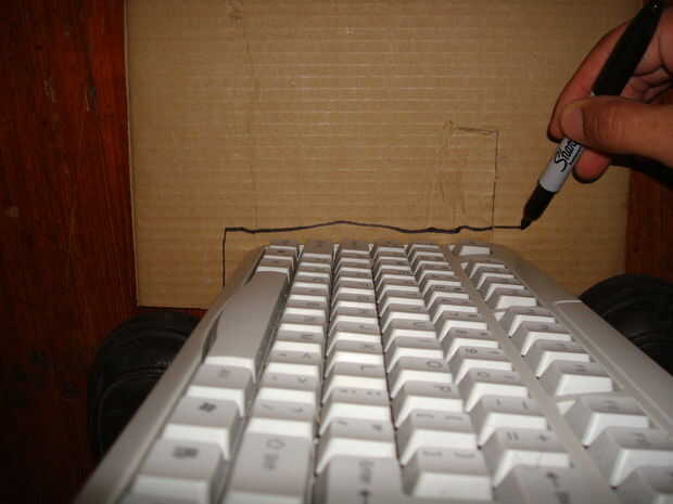 Corte un agujero en la parte inferior de esa pieza que se ajuste a tu teclado. Quitar las muescas de la parte superior de la misma para que pueda funcionar como una ranura en una ficha que hará en el siguiente paso.