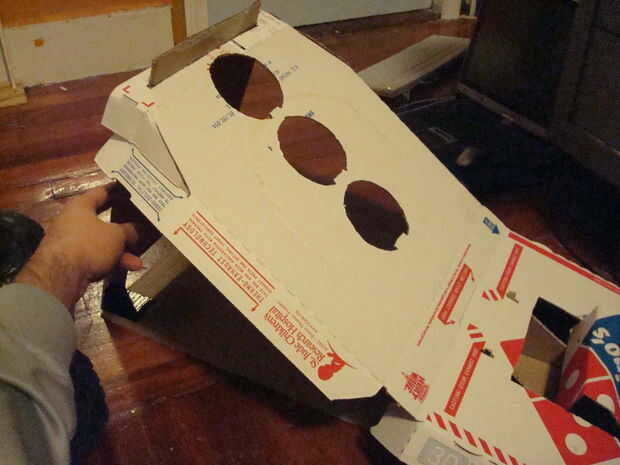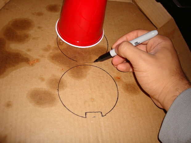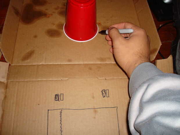 -Marcar y cortar los agujeros en la caja de la pizza. Un conjunto de ranuras para el apoyo de la rampa, la rampa contorno y agujeros en el cual te Coloque las tazas.