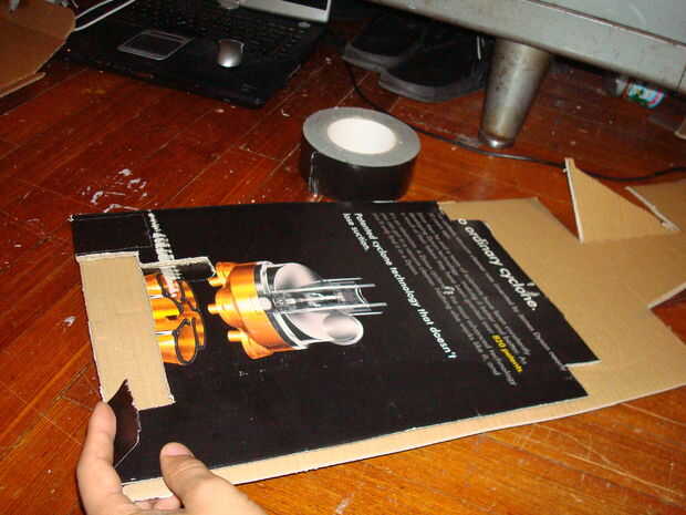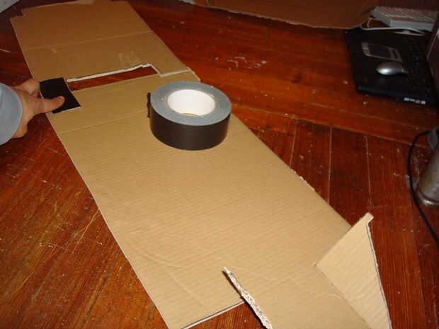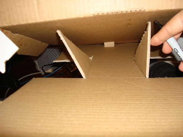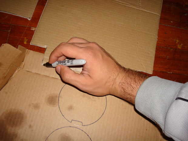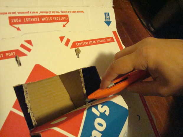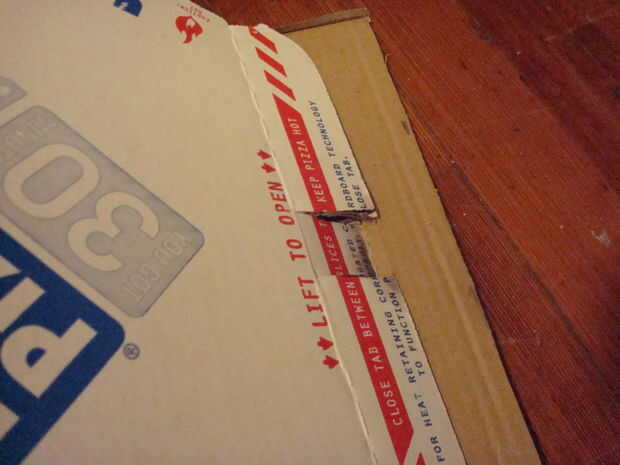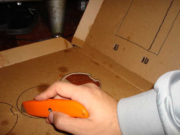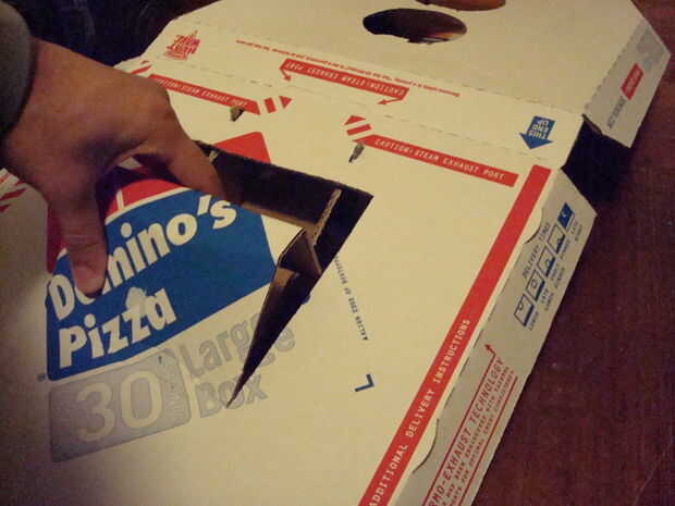 -Cortar una pestaña en la parte inferior la mitad de la caja de pizza que puede deslizarse en una ranura cortada en la placa base en el último paso.