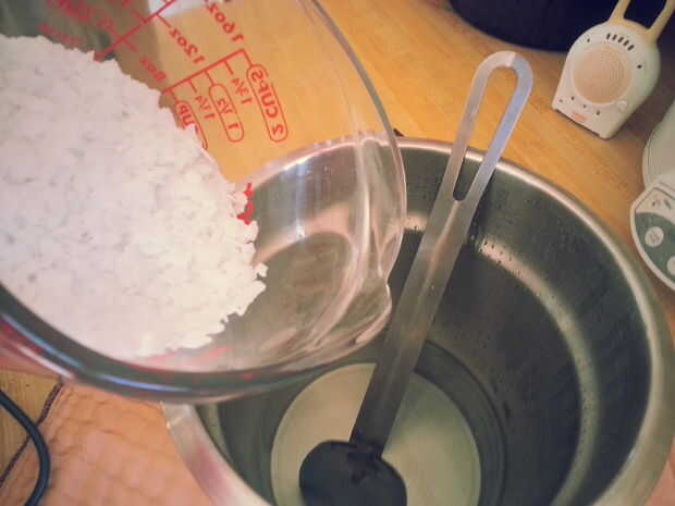 En una olla de acero inoxidable, llenan el 32,9 oz de agua destilada y colocarlo sobre una superficie segura de calor. Prepárate verter la lejía de 9,39 oz en el agua. Repetición: verter la lejía en el agua, No verter el agua en la lejía!