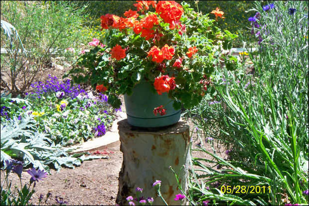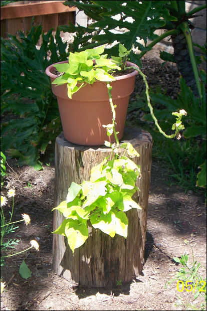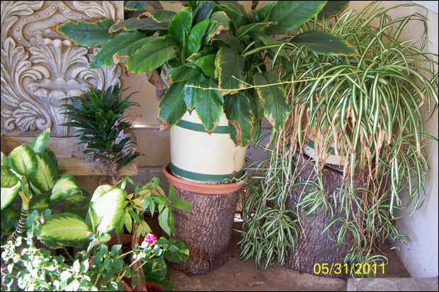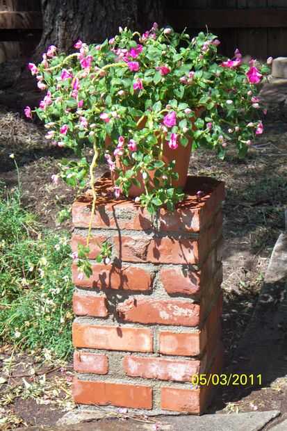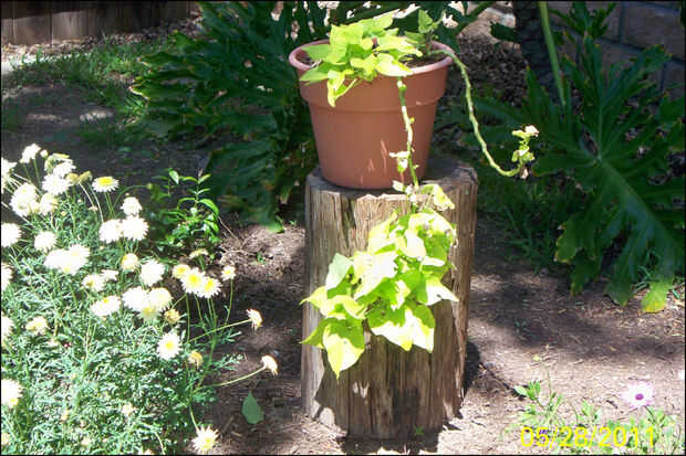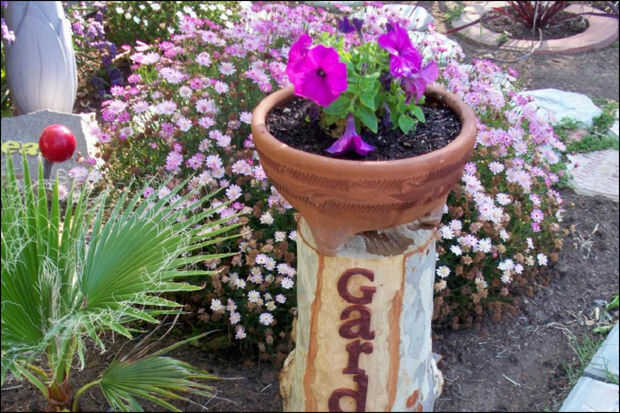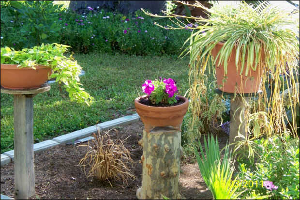 he encontrado que una buena forma de agregar variedad a un jardín ideal, o en un patio, etc., es hacer soportes de jardinera para plantas en maceta. Puede utilizarse una variedad de métodos y materiales, algunos de los cuales son muy baratos o incluso gratis. Por ejemplo, había salvado algunas secciones del árbol cuando un servicio de jardinería remoción de algunos árboles. Otra vez, un poste de teléfonos había sido soplado, y pedí a los equipos de la ciudad si pudiera conseguir algunos pedazos del poste que se corte por la limpieza. Una sección de 4 x 4, cortar a la longitud desea y una pieza redonda de madera contrachapada, o sólo un trozo de madera se puede colocar en un agujero cavado en la tierra... entonces no hay ladrillo, por supuesto... los materiales parecen interminables!