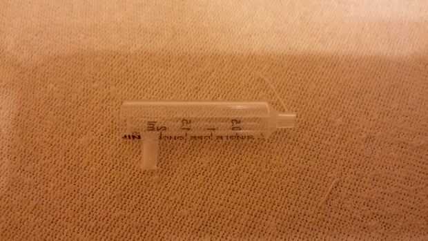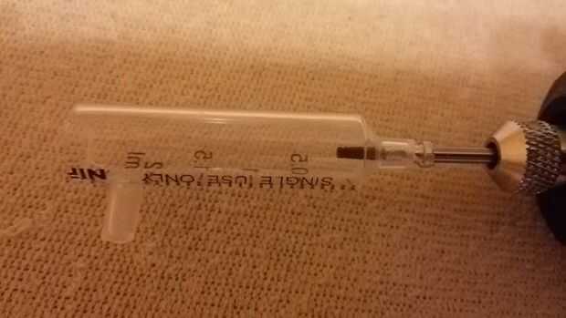 Partir de la tercera jeringa use la pieza donde va la aguja. Corte de jeringa como primero. Utilizar mechero, dremel o combinación para ponerlo en el eje. Tenga cuidado o es flojo o no cabe, así que una progresión lenta.