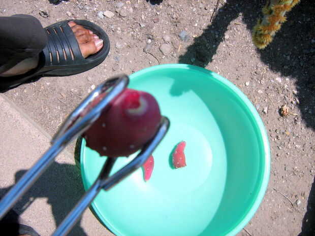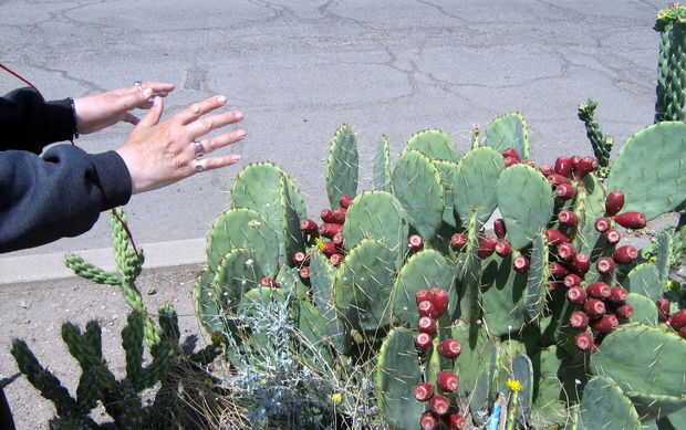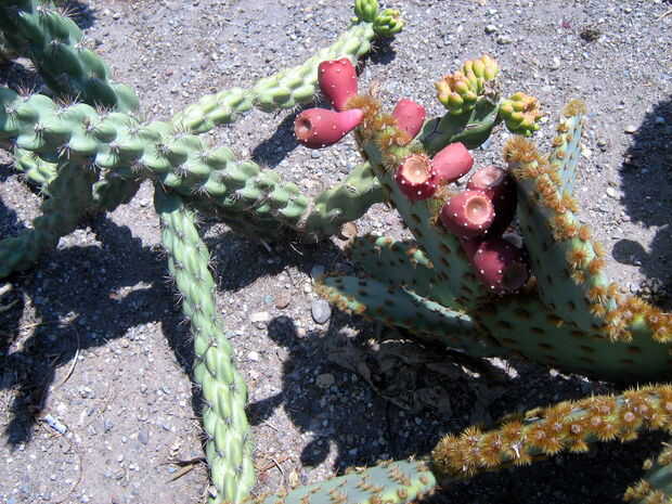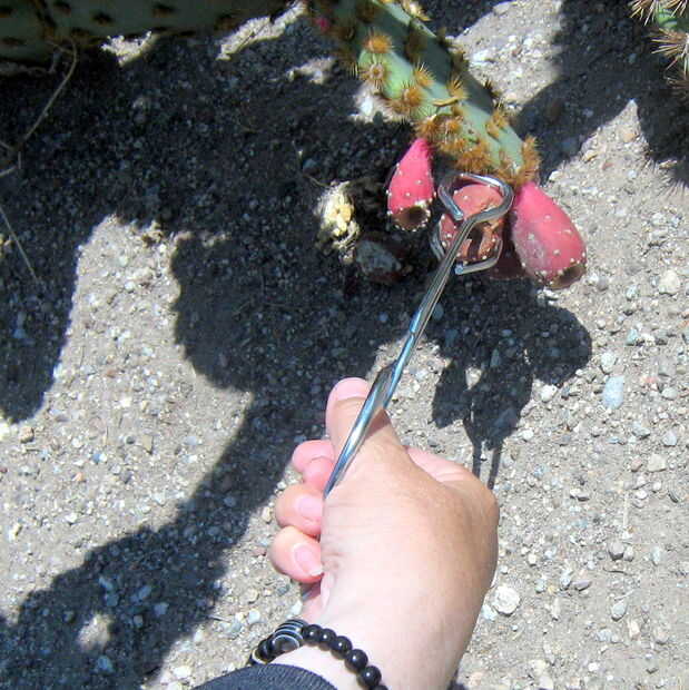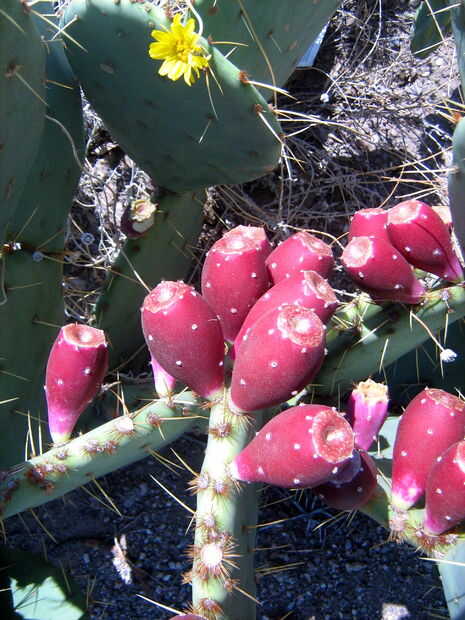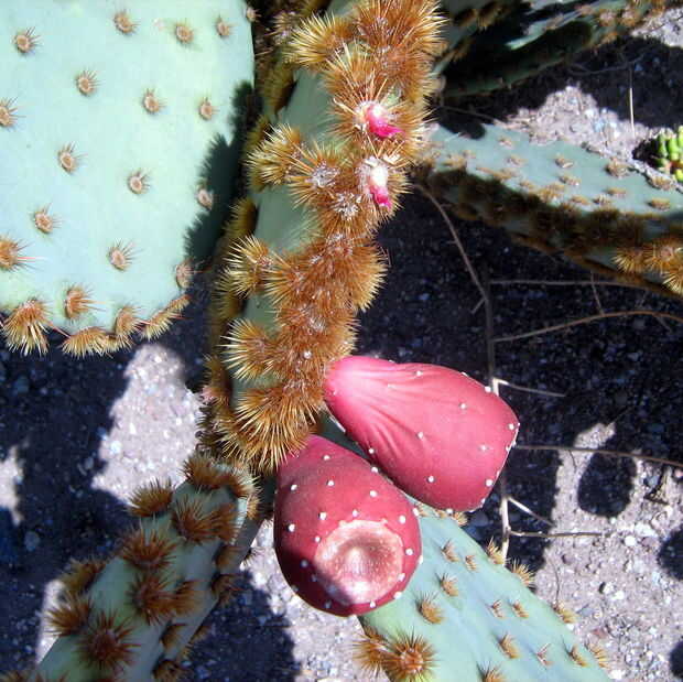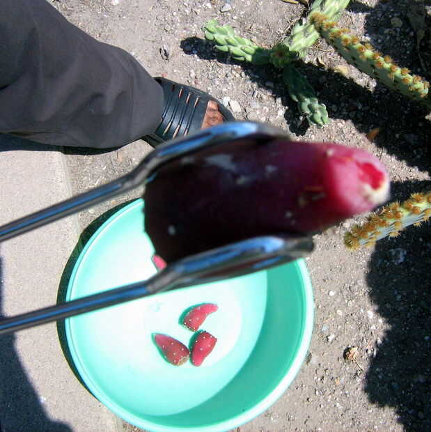 Hay muchas variedades de nopal que crecen por aquí, algunos tienen penachos de espinas más grandes, otros tienen pequeños glouchids escasa. Algunos tienen cojines grandes, otros pequeñas. Hay algunos que han sido criados para tener frutos grandes y grandes almohadillas jugosas; los que por aquí en los patios de la gente ven como los que crecen salvajes en el desierto de las afueras. Estas variedades pueden venir maduras en momentos ligeramente diferentes y pueden tener diferentes sabores y texturas. Todas son buenas. De hecho, los frutos de muchas especies de cactus que crecen aquí son buenos para comer y puede ser preparado por este mismo método.