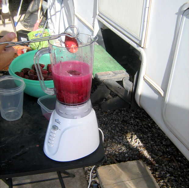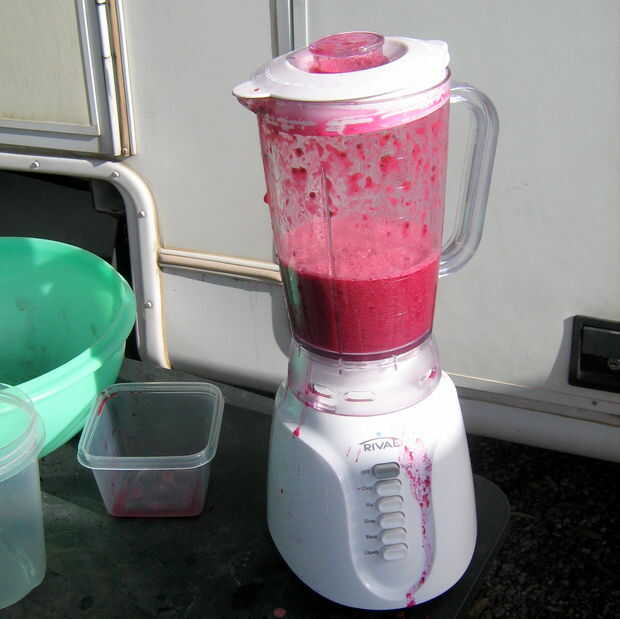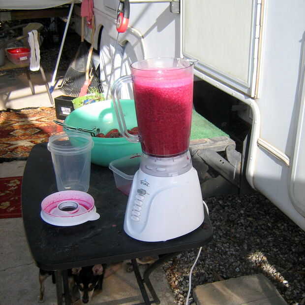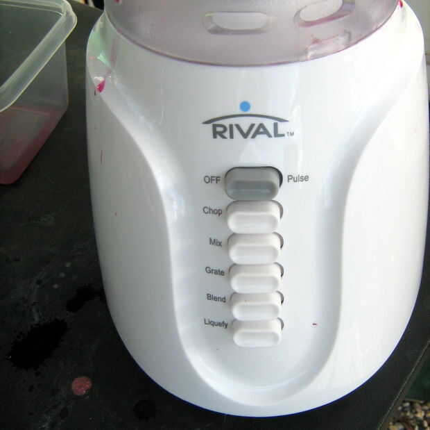A continuación, ponemos en la batidora, unos pocos a la vez, añadiendo un poco de agua o jugo del lote anterior para conseguir comenzó. Empezar a licuar a baja velocidad y luego trabajar hasta alta. Si estás en un área remota y no tienen poder o un blender probablemente puede usar un machacador o una amoladora de mano, lo que usted tiene.