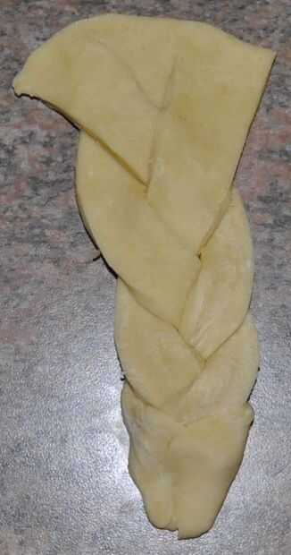 Ahora vamos a la trenza / tejer, trenzar la masa como si fuera pelo en una coleta. Una vez usted ha trenzado la prensa de masa las puntas juntas.