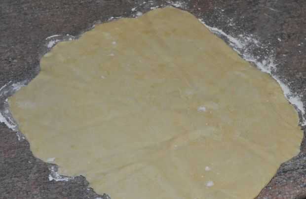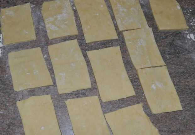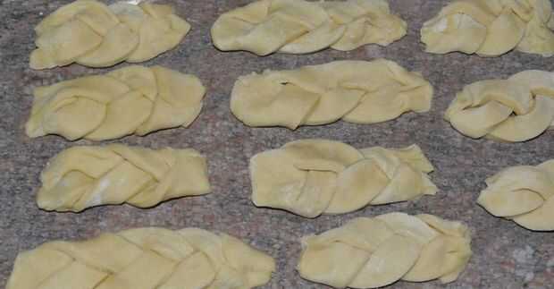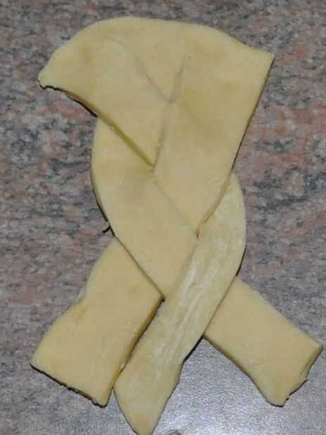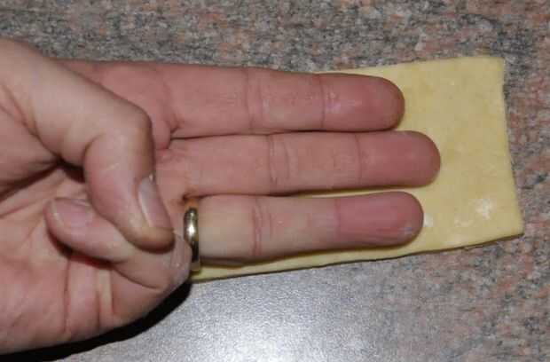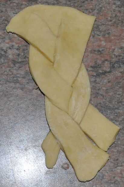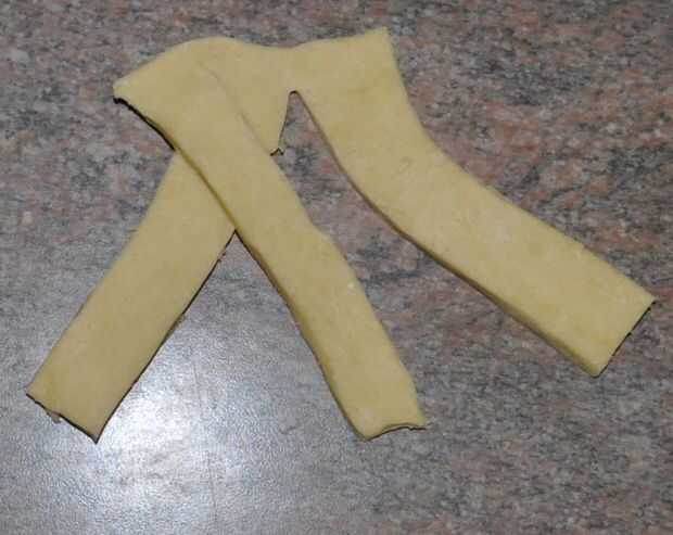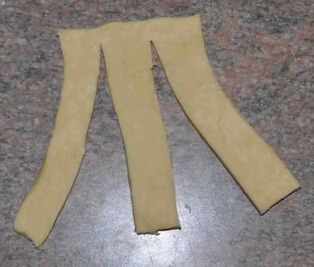 Estirar la masa hasta unos 5mm (0.2 pulgadas) de espesor. Asegúrese de que en esté por lo menos 7 a 9cm (2.75 a 3.5 pulgadas) de largo. Cortar la masa en 5cm (1,96 pulgadas) las amplias tiras. Dividir cada tira (bloque de 8 x 5cm) en tres franjas iguales, llamados dedos. No separan bien a través de pero dejarlos conectados en un extremo. Esto debe dejar con bloques de 8 x 5cm de pasta con tres "dedos" pero todo sigue conectado en un extremo.
