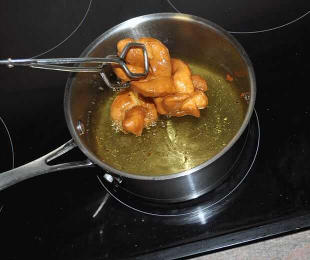 El aceite no debe estar demasiado caliente. El más caliente el aceite, será el más "crujiente" fuera de "koeksister" . Esto también sucederá si los deja en demasiado tiempo. Debe normalmente basta girar una luz amarilla, oro marrón antes de llevarlos fuera del aceite.