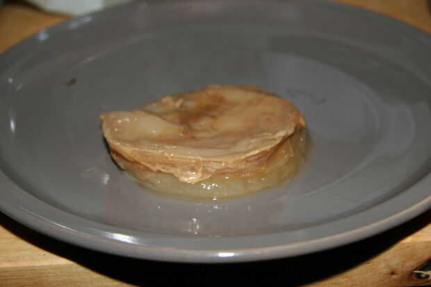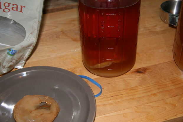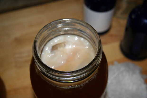 A continuación, usted querrá tomar la mitad del scoby de la fermentación de kombucha y 1 taza de kombucha y agregarlos a la mezcla de té y azúcar empapada. Esto acercará a llenar la jarra.