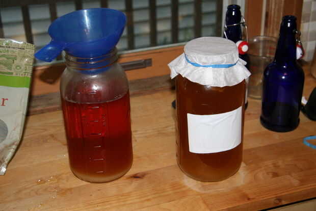 En sus primeros lotes, usted querrá doble las cosas, cada vez, a partir de dos frascos nuevos para cada frasco que toque. Para mi primera hornada, empecé dos tarros de té, con la mitad de una botella de 16 onzas de kombucha (sin sabor, cruda) comercial en cada uno. El scoby sí mismo no es necesario, hay suficientes levaduras y bacterias en una cultura viva kombucha para iniciar el proceso.
