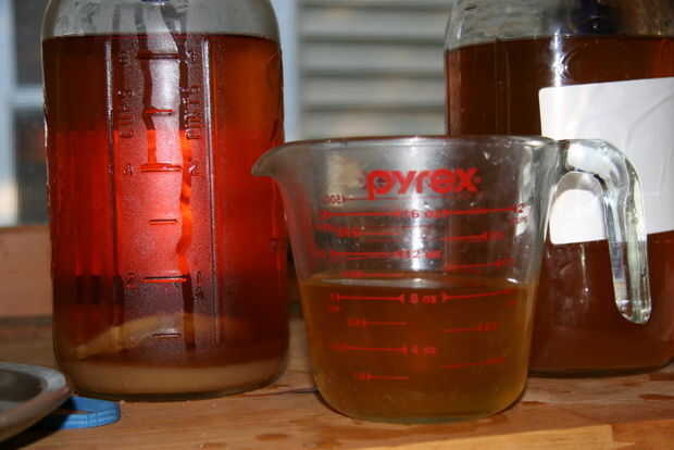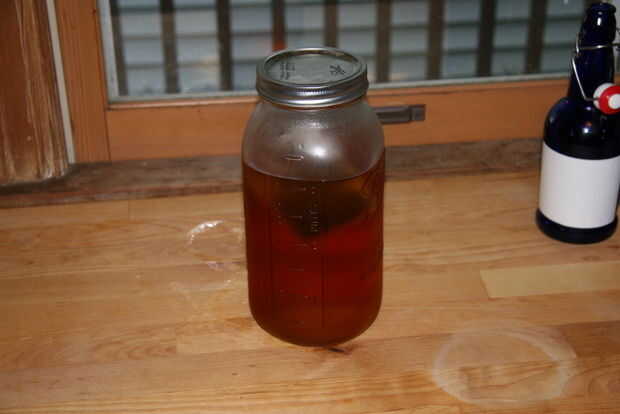 Cuando el té se ha empapado, tomar la jarra de la nevera y tomar su tarro más antiguo de fermentación de kombucha de donde siempre es mantenerlos.