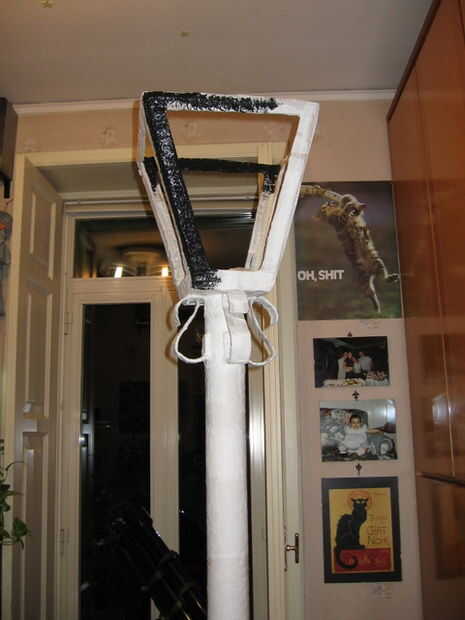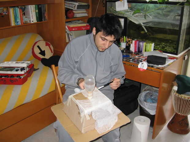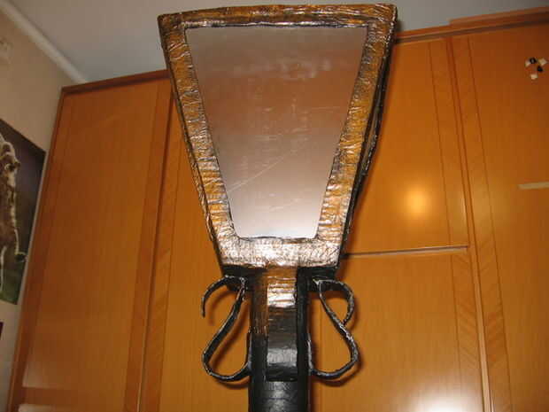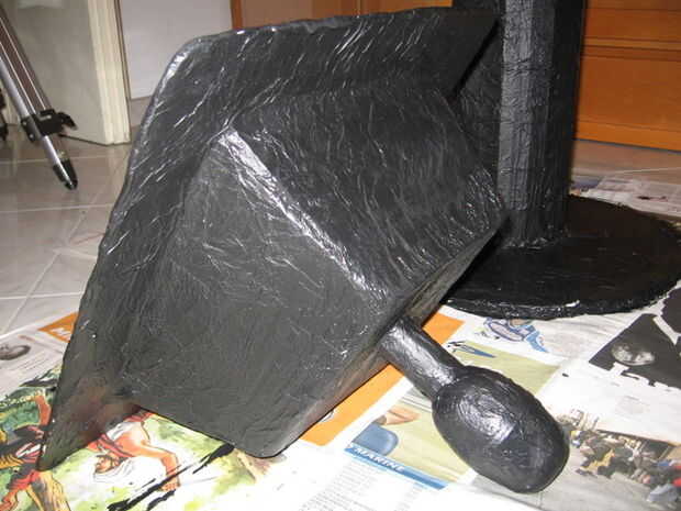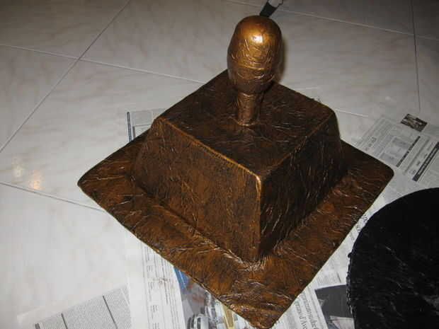 Hacer la estructura en cartón y cubrirlo con papel de cocina y mezcla de agua y vinilo adhesivo. Esperar un día o dos hasta que esté todo seco. Así que pintar todo de negro y después, con una esponja, pintar todos los colores metálicos (ej. bronce).
