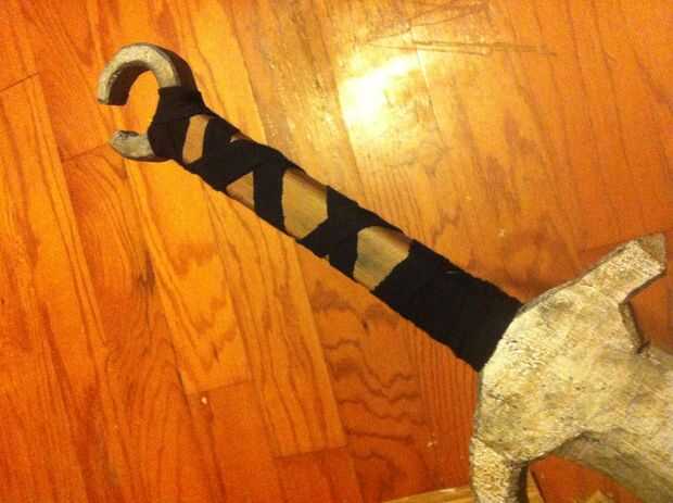 La última cosa que quería hacer era envolver el mango. Corté un largo, pulgadas de cinta ancha de tela negra de una camiseta vieja para adelgaza. Lo envolvió un par de veces en la parte superior bajo el protector de mano y me fui hacia abajo la manija en ángulo. Fui en el interior del pomo así antes de espiral hacia arriba en la dirección opuesta y atar apagado en la parte superior otra vez.