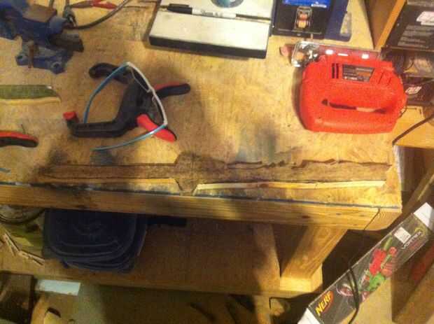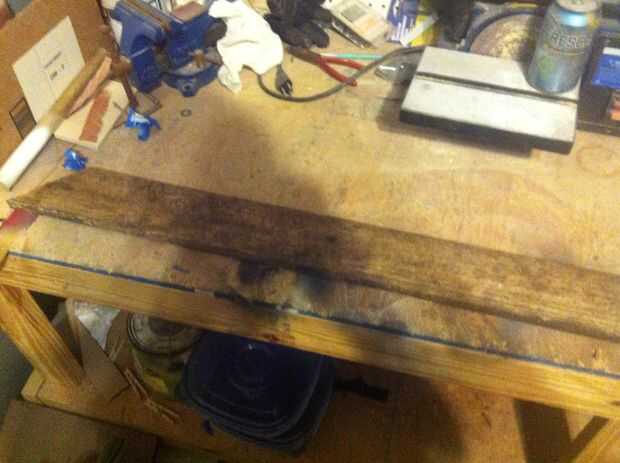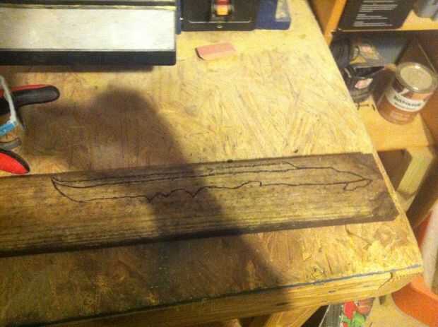 Empecé dibujando la forma de la pieza base de la espada en el lado del filtro de mi tabla con un rotulador, asegurándose de que estaba centrada y una buena longitud partida. He añadido algún sobrante al mango por lo que podía cortar una vez pude sentir lo grande que era. Después de eso yo simplemente recórtalo usando la sierra caladora con una hoja de madera de corte regular. Una vez que fue cortado me puso otra vez la base sobre el tablero y había utilizado como una guía para el diseño de la pieza posterior. Quería que esta pieza a ver roto y reparado, por lo tanto las piezas separadas. Otra vez fue recortar con la sierra caladora. Finalmente usé ambas piezas como una guía para el diseño de la punta de la hoja que estaba, otra vez, cortar con la sierra caladora.