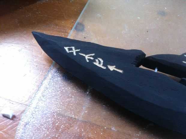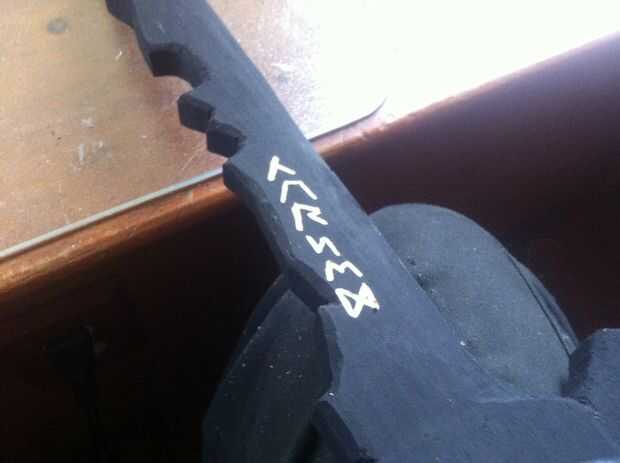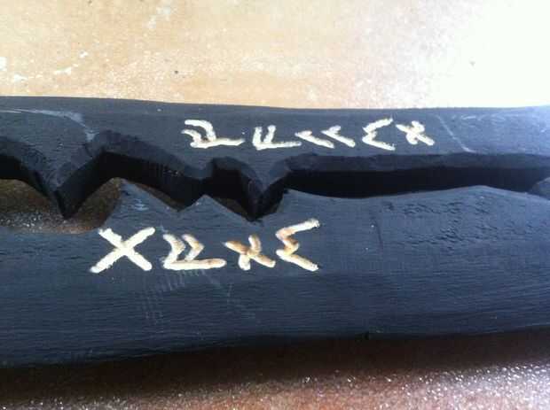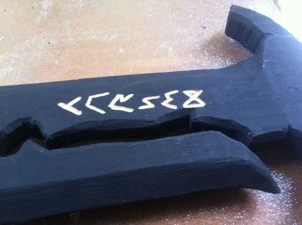 Una vez que todos los pernos se realizaron di cada pieza una capa completa de acrílico negro. Lo hice primero por lo que pude ver lo estaba esculpiendo mejor. Después de que la pintura seque completamente (durante la noche) usé mi Dremel con una broca pequeña para tallar en las runas en las caras de la hoja. Por esta razón quería ahorrar espacio en las caras. Para las runas simplemente encontré una tabla del alfabeto rúnico en imágenes de Google, así que lo más probable es que no es exacto, pero no iba de precisión con esta espada. Algunas de las runas deletrear palabras, algunas no, son simplemente decorativas.