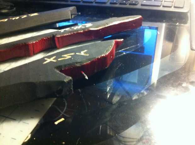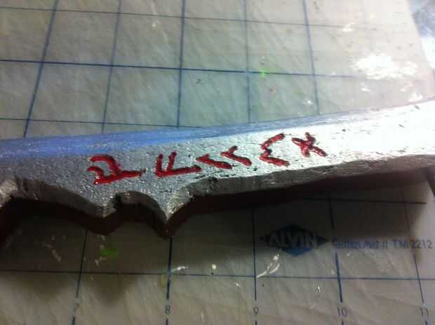 Ahora en la pintura, como el título sugiere. Lo primero que hice fue pintar los bordes interiores rojo, tuvo unas pocas capas para obtener buena apariencia exterior. Una vez que seco me pintado el resto de la plata de la hoja y rellena las runas con más rojo. Finalmente pinté el mango marrón.