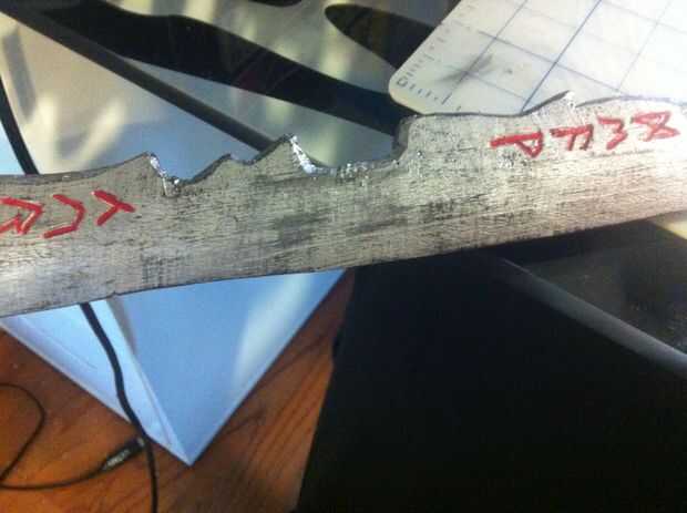 Ahora que la pintura haya secado su tiempo para hacer esta cosa parezca antiguo. A sucio hasta seco cepillado todo sobre los pedazos de hoja con acrílico negro para que se vea usado. Para ello también a la manija para romper para arriba la pintura marrón. Para que se vea un poco más realista que hice una capa más ligera del marrón en los pedazos de hoja para simular óxido. Poco de pintura tiene en los bordes interiores y runas, así que les di otra capa de rojo también.