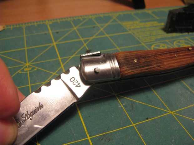No vamos a entrar en la parte del proceso de montaje donde ejercer presión sobre partes del cuchillo para ajustar la tensión de la backspring: no ponga presión sobre la marcha de Laguiole, de lo contrario la tensión general será empujarlo fuera de alineación - que a su vez se mete con la estética de su cuchillo. Y usted necesitará fijar más adelante de todos modos. Para no hacerlo!