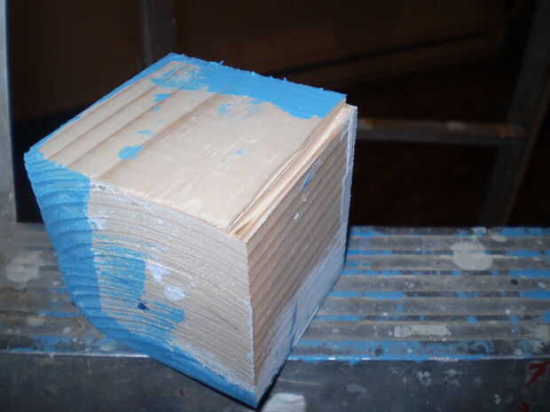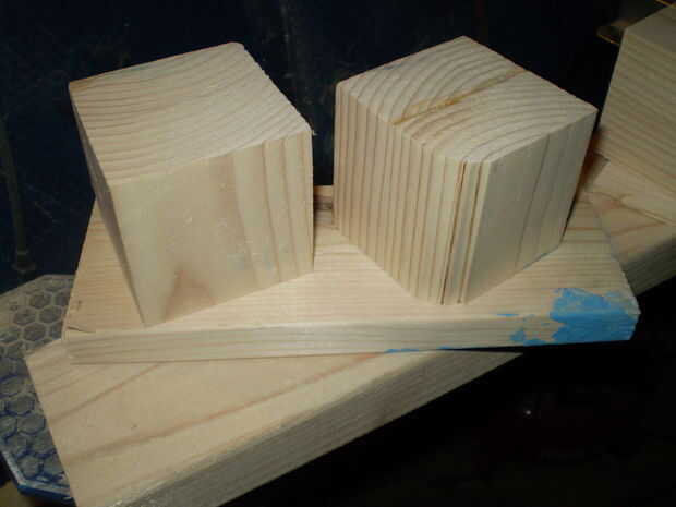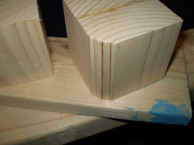 a continuación recortar el cuadrado de bloques. Usé mi sierra para esto pero se puede utilizar una sierra. Una vez que los bloques son cuadrados y cortados a la medida, pase un extremo del bloque. Por una esquina exterior que tenga el borde posterior de la muesca.