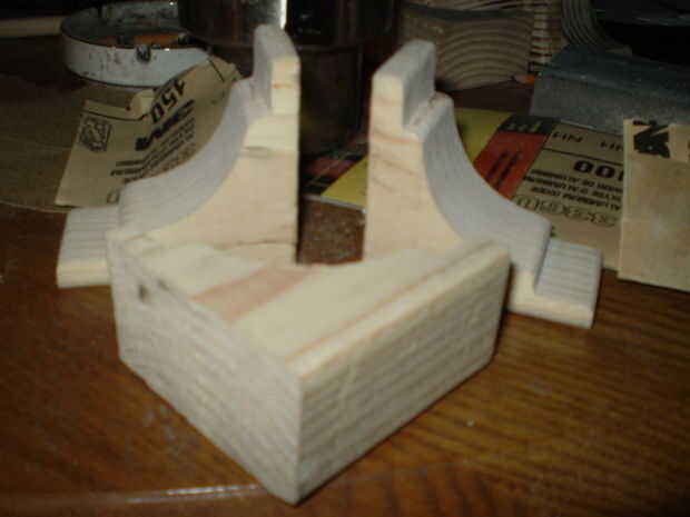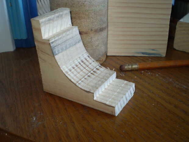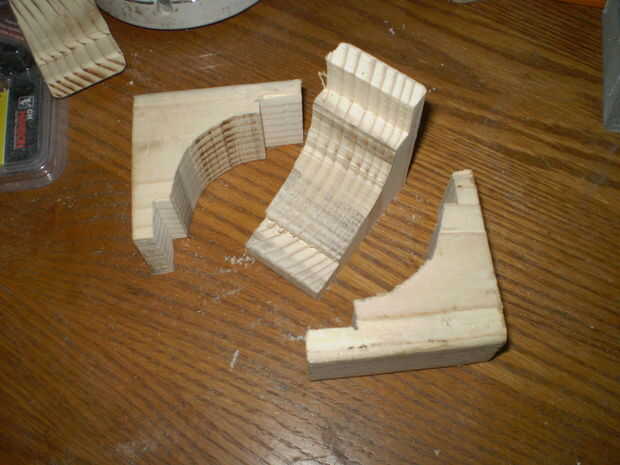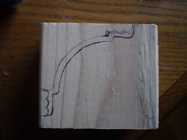 Para hacer los bloques de canter empecé trazando el perfil de la corona de una sola pieza de 2 "x 4".  Entonces trazó un perfil más ancho que el perfil de 1/4".  Utilizando la Sierra de cinta corte a la línea de perfil más ancho.  Después se cortaban todos los bloques fueron todos los enarenados.