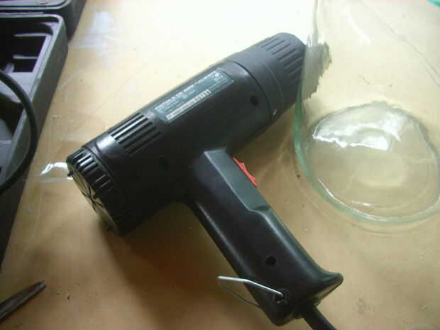 Girar la pistola de calor. Mina tiene dos posiciones, utilizadas el más bajo. Supongo que el mayor tiene el riesgo de ardor PET o romper la botella.