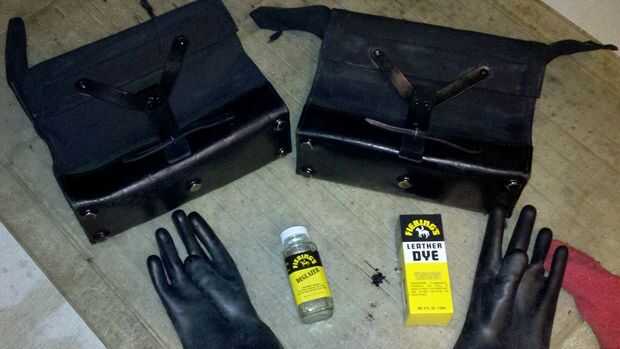 Tinte de cuero de Fiebing puede encontrarse en una tienda local de la flota y la granja en la sección de silla de montar del caballo. Este producto de tinte líquido tiene un hisopo de algodón en la parte superior de la tapa para aplicar el líquido sobre el producto. 4 oz botella de colorante fue apenas suficiente para ambas bolsas.