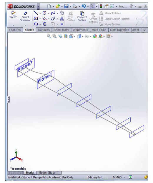 Con los puntos del bosquejo como referencia añada un nuevo plano de dibujo. Para agregar un nuevo plano dibujo ir a la "geometría de referencia" y haga clic en "plano" luego seleccione el plano que se encuentra en una sección transversal a través de la hoja